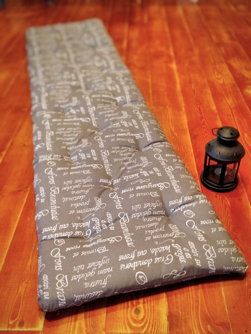 Sedák na sedačku či lavici s písmem 🙂 plněno několika vrstvami dutého rouna, prošívané.