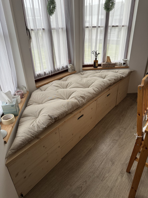 Sedáky nejen na lavice, ale i okno, režná potahová 🙂 plněno několika vrstvami dutého rouna, prošívané.