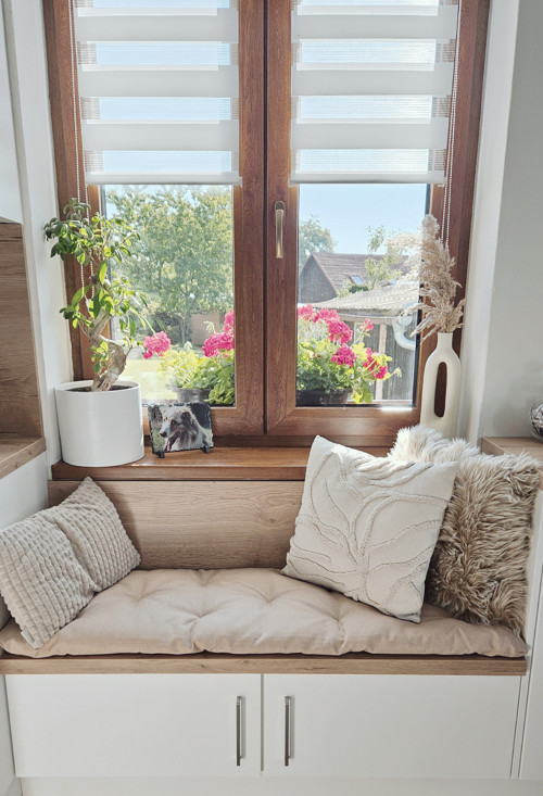 Sedáky nejen na lavice, ale i okno, režná potahová:) plněno několika vrstvami dutého rouna, prošívané.