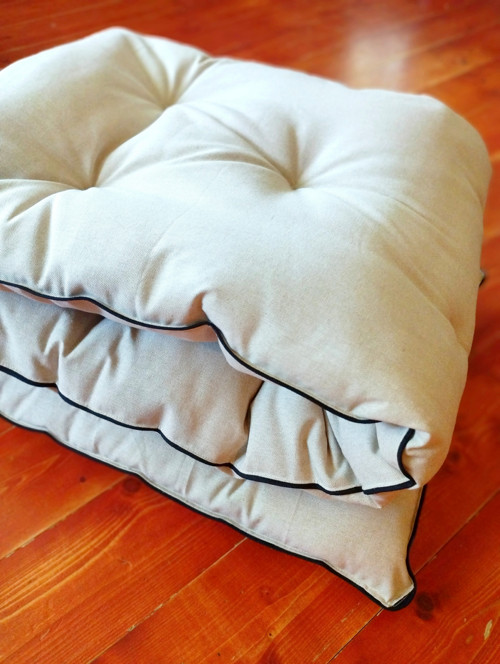 Sedák na lavici v kuchyni z režné látky se všitým lemem 🙂 plněno několika vrstvami dutého rouna, prošívané.