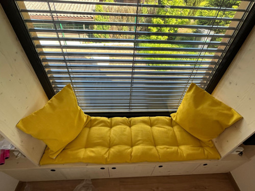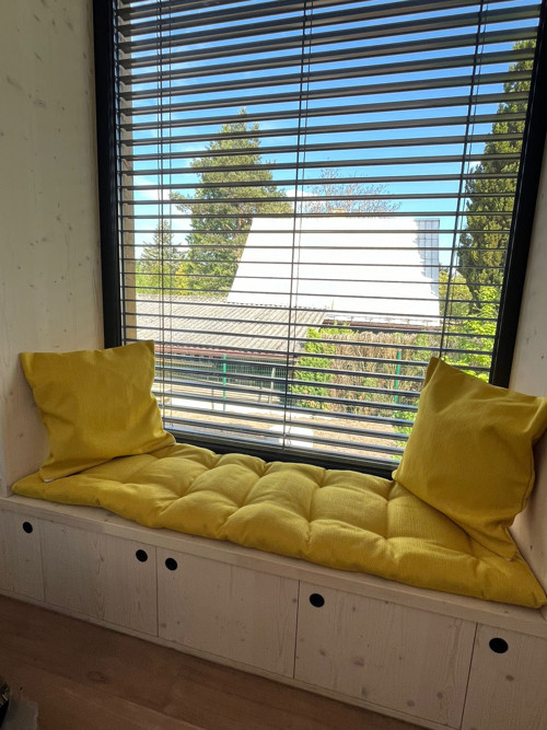 Sedáky nejen na lavice, ale i okno,žlutá potahová 🙂 plněno několika vrstvami dutého rouna, prošívané.