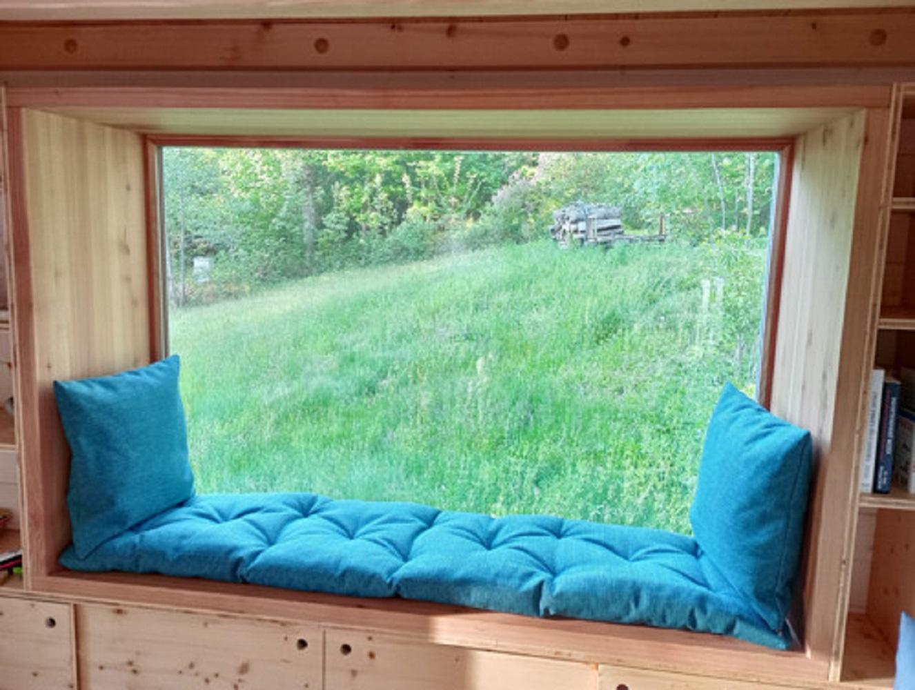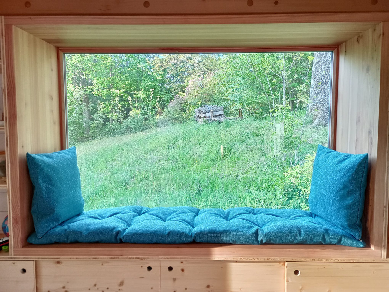 Sedáky nejen na lavice, ale i okno,žlutá potahová 🙂 plněno několika vrstvami dutého rouna, prošívané.